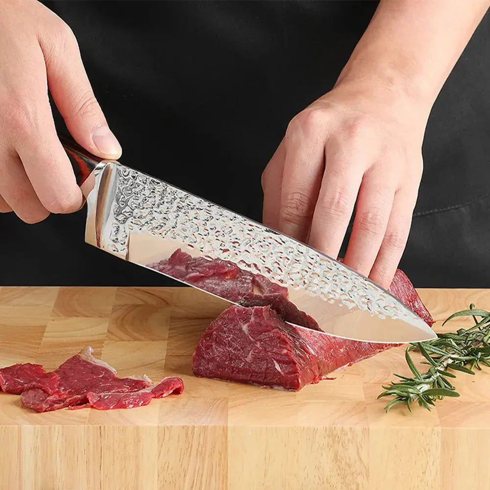 Master every cut in the kitchen with this 15-piece knife block set, a perfect balance of craftsmanship, precision, and lasting performance. Each full-tang blade is forged from high-carbon stainless steel, featuring a hammered finish and a finely honed V-shaped edge that glides through ingredients with minimal effort. From slicing crusty bread to carving tender roasts, the set offers a knife for every task, including a chefβs knife, bread knife, santoku knife, slicing knife, boning knife, utility knife, paring knife, and six steak knives. The sharpening steel keeps edges razor-sharp, while the all-purpose kitchen shears handle everything from trimming herbs to cutting poultry. Each knife is fitted with an ergonomic wooden handle secured by three stainless steel rivets for a secure grip and long-term durability. The solid wood storage block keeps your tools organized and protected, making this knife block set an essential investment for home cooks and professionals who demand performance, comfort, and style in every slice.